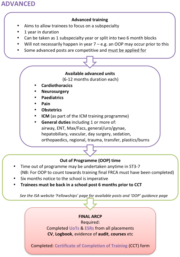 The General duties unit of training at this level differs from elsewhere in training as there is no necessity to cover all areas. As per the curriculum: "It is expected that the vast majority of anaesthetic trainees will do twelve months of ‘general duties’; as a minimum all trainees must do six months; those doing less than twelve months must receive prospective approval from the RCoA Training Department."